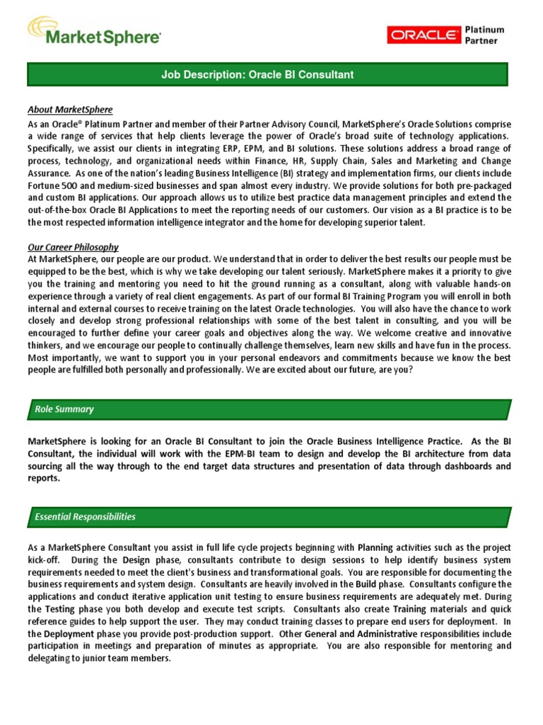 Technical Consultant Job Description | Templates at ... from www.allbusinesstemplates.com And testing of oracle applications financials 11i/11.3/11.5.7 with multi reporting currency (mrc). Start editing this oracle financial functional consultant resume sample with our online resume builder. 2+ years' experience as a functional consultant in oracle fusion financial modules (ap, fa, gl) implementation/ upgrade projects. Oracle primavera technical consultant job location: United arab emirates job requirements: Provide obiee, oracle etl processing, and data modelling support for a data warehouse; We require 2 oracle financial functional consultants for an immediate start. They must also procure the relevant job or consulting license to operate in their state.